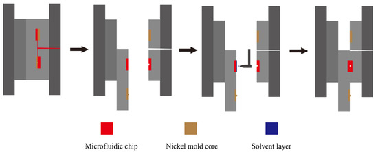 The combination of thermal bonding and solvent bonding would probably be an ideal choice in the fabrication of microfluidic chips. Assisted with solvent exposure, thermal bonding can achieve very high bonding strength [19,20]. In this study, in order to shorten the manufacturing time while optimizing the bonding quality, a solvent-assisted in-mold bonding method was proposed, especially for the scale-up production of microfluidic chips. The replication-based fabrication process and back-end process of microfluidic chips can be realized in a single mold. In this work, the proper organic solvents were determined by compatibility testing based on the principle of solvent solubility. The influences of solvent ratios on the surface roughness, microchannel morphology, and contact angle of microfluidic chips were investigated. Since the solvent bonding is integrated into the mold, the effects of the solvent volume fraction, applied volume, bonding pressure, and bonding time on the bonding quality were analyzed and optimized. This study aims to achieve the high-quality, short-period integration of fabricating techniques for microfluidic chips in mass production.