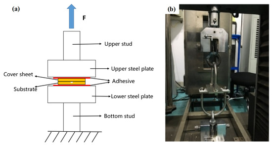 The test method of bonding strength: (a) the tensile strength test schematic and (b) the image of experimental setup. (F: force).