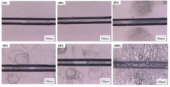After the chip substrate was treated with different volume fractions of organic solvents, the surface morphology of the microchannels was investigated, as illustrated in Figure 6. When the volume fraction of cyclohexane was below 55%, the surface was relatively smooth and no obvious damage was found in the microchannels. With the further increase in volume fraction, the surface of the microfluidic chip is dissolved to a certain extent. Unevenness and partial deformation of the microchannels can be observed while the overall structure is still in a good condition. However, the treatment with pure cyclohexane causes plenty of pits on the chip surface, which affects the integrity of the microchannels. Combined with the analysis of surface morphology and roughness, it can be found that pure cyclohexane or a high-volume fraction of cyclohexane has excessive solubility to COC and is not suitable as the solvent treatment on the substrate surface for bonding.