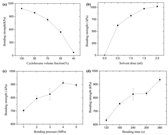 The effect of (a) cyclohexane volume fraction, (b) solvent dose, (c) bonding pressure, and (d) bonding time on the bonding strength.