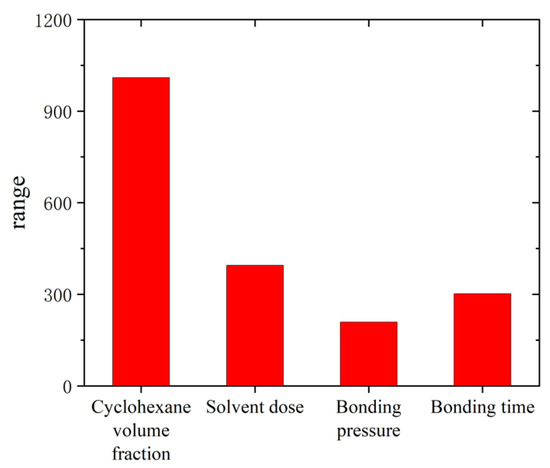 To clarify the significance of the influence of each factor, the range change curve under each process is presented in Figure 9. It can be seen that the most significant factor influencing each process is the cyclohexane volume fraction. Obviously, the cyclohexane volume fraction is the key factor to affect the bond quality, leading to the variation of bonding strength by affecting the dissolution of the polymer. The solvent dose also affects the dissolution of the polymer by affecting the polymer compared to the cyclohexane volume fraction. Additionally, the bond pressure and time cause less variation to the bonding strength.