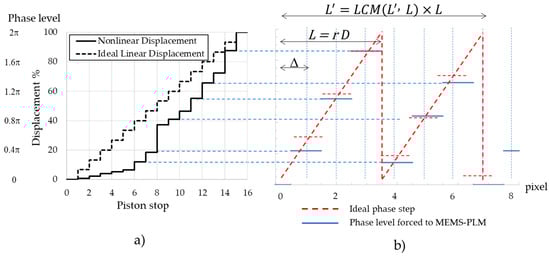 where is the number of the discretization levels; is the maximum phase modulation, for example, and are the diffraction orders []. According to Equation (1), the diffraction efficiency of the first-order diffraction approaches 100% as and approach and infinity, respectively. However, for beam steering using pixelated MEMS PLM, this is not the case. First, the number of phase levels is limited, i.e., 16 levels for TI-PLM. In addition, the phase levels are not equally distributed across the range of 0 to but are distributed rather non-uniformly. In Figure 2a, the solid line plots the mechanical displacement of MEMS pixels of sixteen phase levels []. The maximum displacement of 100% modulates phase in at a wavelength of 633 nm. Compared with the equally distributed phase levels (the dotted line), phase modulation depths between 20 and 40% are not available. This is due to the limited degree of freedom in controlling electrostatic force between the MEMS mirror and the electrodes. Aside from the non-equally distributed phase levels, the period of the CGH for beam steering is not necessarily an integer multiple of physical pixel period D (i.e., 10.8 um for TI-PLM), but it is rather a non-integer multiple of D, rD, where is any real number to steer the beam in a quasi-continuous manner across the field of view.