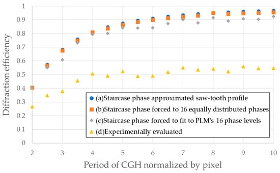 Diffraction efficiency of CGH for (a) staircase phase-approximated sawtooth profile, (b) staircase phase approximated and forced to fit 16 equally distributed phases across 0 to 2π, (c) staircase phase forced to fit TI-PLM’s available 16 phase levels (Figure 2a). and (d) experimentally evaluated.