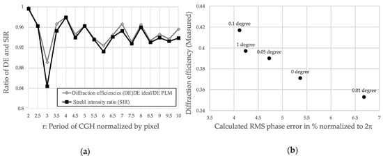 where and denote the sawtooth phase profile and the staircase-approximated phase profile for which phase levels were forced to the realizable phase levels depicted in Figure 2; N is the number of pixels within a single complete period of CGH; and D is the physical dimension of the pixels, i.e., 10.8 mm. Figure 5a plots the Strehl intensity ratio () of the non-equal phase levels of CGH (Figure 3, case c) and the calculated ratio of the DE of the PLM-forced phase levels of CGH to the DE of the sawtooth phase of CGH. The proximity of the two data points shows that the DE of CGH is well-correlated with the standard deviation of the phase values via SIR.