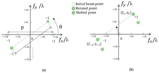Iterative algorithms, such as the Gerchberg–Saxton phase retrieval algorithm, calculate the CGH with an arbitrary number of points with a variable power ratio []. Multi-point beam steering benefits the frame rate by avoiding time-consuming raster scanning of objects. However, computational time prohibits such an iterative CGH calculation algorithm from being used for beam steering in real-time applications, such as automotive lidars. Here, we experimentally evaluated the DE of two completely deterministic CGH calculation algorithms to steer the beam into two regions of interest. We first describe the CGH calculation algorithm for two points using binary -phase grating, followed by the addition of complex fields. Figure 6a,b schematically depicts the first CGH calculation methods using binary -phase grating. Consider two steering points within the maximum angular range of TI-PLM, λ/D, where λ and D are the wavelength and pixel period of MEMS PLM, respectively. To generate two arbitrary points within the angular range, a binary -phase grating with +1 and −1 orders with an angular separation of p = l/(rD) is rotated, and phase tilt is added in the amount of (q, r). The rotation and phase tilt are given by: