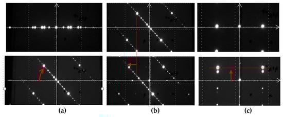 The experimental results of two-point beam steering by rotation and the linear shift along the x- and y-directions are depicted in Figure 7a,b, and c respectively.