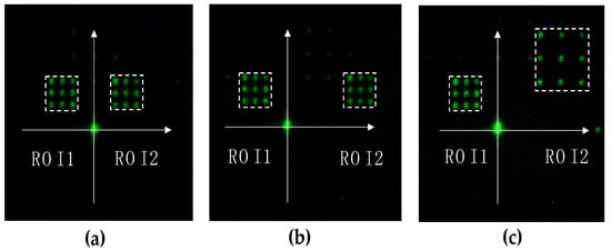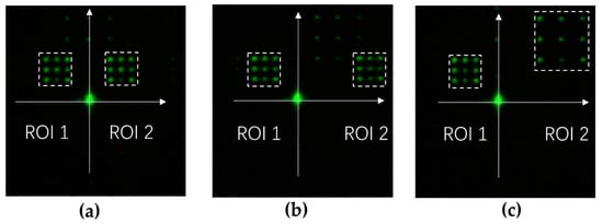 where represents the complex field in the CGH plane. Figure 9 shows the experimental result of two-point beam steering for two ROIs. In a similar way to beam steering using a binary π phase pattern, each ROI was scanned point by point with the CGH that steers the beam into two points. For example, as shown in Figure 9a, the ROIs were scanned from the top-left to the bottom-right. As Figure 9b, c show, arbitrary ROIs were defined and scanned simultaneously.