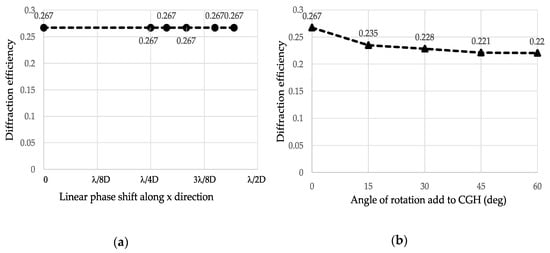 (a) Diffraction efficiency of a CGH for single-point beam steering of period number r = 2 with horizontal shift, and (b) DE for single-point beam steering of period number 2 with rotation.