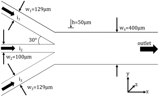 One of the main targets of the present work was to define a benchmark microchannel geometry which might be used to study the dynamics of the interface in relation to different applications. We took into consideration the following: the study of the interface under symmetric and non-symmetric perturbations. This is the reason why we designed a three-entrance microchannel symmetric geometry. The non-symmetry will be induced to the interface using different flow rates or fluids on the lateral branches. The angle of 30 is very common in many configurations, e.g., the branches in a respiratory system, and the Y-microchannel configuration used in mixing [21]. Finally, we decided to have the main width of 400 m and an aspect ratio of 0.125. At this dimension and ratio, the influence of gravity can be neglected, and the flow dynamics are very close to the Hele–Shaw flow. We chose the ratio between the central inlet channel and the main channel 1:4 because one of our targets is to also to study the stability of a viscoelastic fluid interface and this extension/contraction flow is used in non-Newtonian studies.