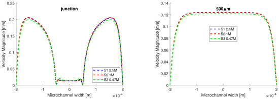 Given that the VOF method is very numerically expensive, the grid test was performed using the same initial and boundary conditions described above, in laminar flow, with a single working fluid, water. The velocity distribution is plotted on two lines perpendicular to the flow field in Figure 2, one at the junction, and the other at 500 away, where the flow was fully developed. The results from the third simulation, where a coarser mesh was used, differ from the first two, which were performed on the finer meshes. As such, we proceed further using the first two meshes.