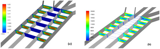In Figure 3a, the contours of velocity magnitude are presented. The contours are displayed on six planes that are perpendicular to the flow. The distance between the planes is 100 . It is notable from the first planes that the velocity profile is not yet fully developed. At the final planes, placed at 400 and 500 away from the junctions, the contours look similar. The maximum velocity recorded in the case of the trifurcation microchannel is 0.24 m/s. In Figure 3b, the contours of vorticity magnitude are presented. The color map was capped at 20,000 1/s to see where the maximum values of vorticity appear.