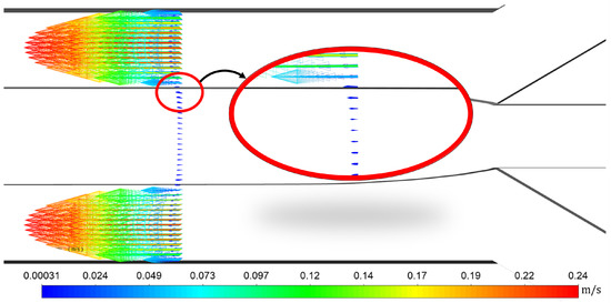 In Figure 4, the velocity vectors are presented starting from a plane of 500 away from the junction. The velocity vectors are presented at a doubled scale to show the parabolic profile of the aqueous phase and its influence on the oil phase. A phenomenon was observed at the interface, due to the high difference in the magnitude of the velocity between the two phases, the interface acts as a moving wall and it drags the oil phase, thus resulting in an accelerated flow near the interface for the oil phase.