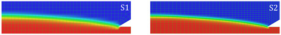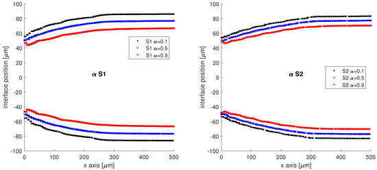 In Figure 6, the interface is reconstructed and the lines of constant volume fraction are presented for both simulations starting from the junction (m) to m on the x axis. The previously reported numerical diffusion can now be observed for the S1 simulation, where the interface band has a thickness of 19.31 m, compared to 12.77 m, the thickness of the S2 band interface. However, when the interface lines of constant volume fraction, , are compared, the two distributions of interfaces are in very good agreement.