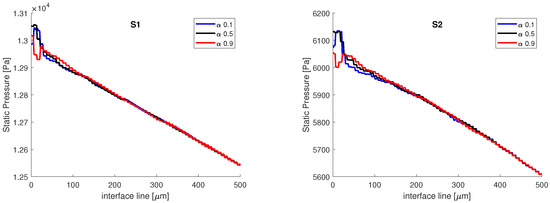 In Figure 8, the static pressure variation on the interface lines of constant volume fraction is presented. The two distributions have the same aspect, with the same pressure variation in the vicinity of the junction on all three lines, and the same pressure drop, from to , Pa. The interface is band, from to , and the values in static pressure match on all three volume fractions after 100 ; therefore, the variations in static pressure recorded in the vicinity of the junction are mainly induced by the curvature of the interface, in accordance with the Laplace equation. We also remark that the influence of the contact angle wetting might be important since the contact/wetting angle has influence over the local interface curvature, as it will be shown in the following section. However, the main difference between the two numerical simulations comes in terms of the magnitude of the static pressure, as the values obtained from the S1 simulation are ≈two times higher than the values obtained from the S2 simulation. The difference in static pressure does not come from the mesh, but from the different algorithms used to couple the velocity with pressure. In the explicit simulation, the PISO algorithm was used, an algorithm that is recommended for transient flows. In the implicit simulation, the SIMPLE algorithm was used, since for PISO, the implicit simulation was diverging very rapidly.