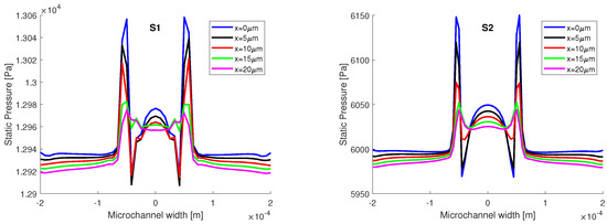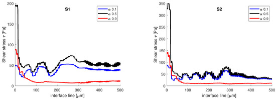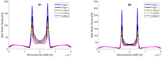 In Figure 11, the distribution of the shear stress is presented on five lines on the top wall, , from the junction with step of 5 to 20 away from the junction. In both simulations, the spikes of shear stress are recorded in the presence of the interface, and since the sunflower oil is more viscous than water, the values of shear stress are higher in the oil phase. There are differences between the two numerical simulations, and in the areas where the extreme values occur, higher values are recorded in the S2 simulation.