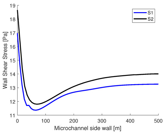 In Figure 12, the shear stress distribution is presented on the sidewall of the main channel at , starting from the junction to 500 . In both simulations, the highest values of shear stress are recorded at the junction. The sudden drop in magnitude after the junction can be explained by the presence of the curved interface. At the 500 mark, the interface is straight, the pressure in the oil phase is equal to the pressure from the aqueous phase, and the shear stress distributions tend towards a constant value.