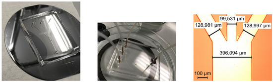 The obtained difference between the design and the microchannel is caused by the photolithographic step from the microfabrication process of the mold. In the photolithographic step, after the positive photoresist was developed, the only photoresist that remained on the silicon wafer was the one on the microchannel geometry. The recipe for the Bosch DRIE etching is standard; therefore, the reason for having a shrunk mold is that the photoresist is overdeveloped. This, in turn, is caused by having a geometry quite large for a microfabrication process. To obtain a perfect mold, either the geometry should have been slightly enlarged or the photolithographic step should have been optimized. The region of interest of the microfabricated PDMS microchannel is displayed in Figure 13 right.