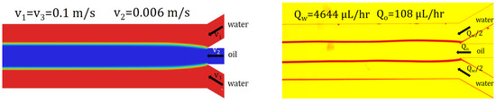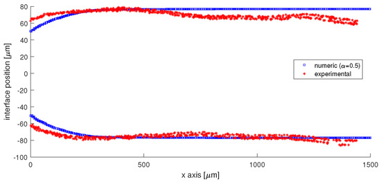 Furthermore, the experimentally obtained image of the interface was digitized using ImageJ and the position of the interface is compared in Figure 15. The difference at the entrance in the main channel between the numerical interfaces and the experimental interfaces comes from the fact that the sunflower oil wets the wall at the junction. As such, the water phase cannot dewet the wall, and alcohol is needed, such as isopropyl alcohol to clean the PDMS wall. The reason why the interface is curved in the main channel is that the flow rates are low, and there is a difference between the contact angle of water with PDMS (≈) and sunflower oil with PDMS (≈).