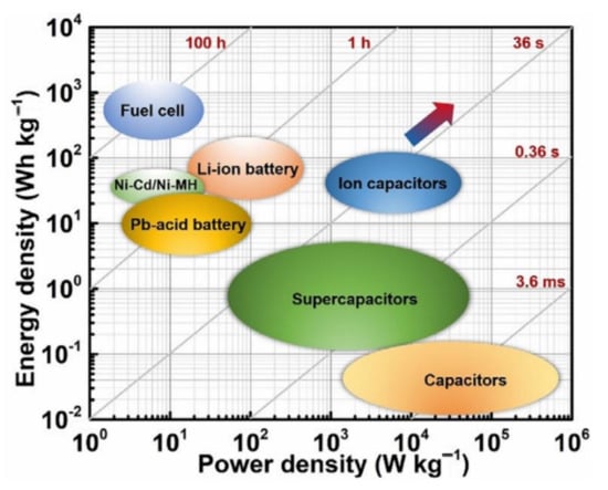 | Type | Energy Density (Wh/kg) | Power Density (W/kg) | Cycle Life (Times) | Efficiency of Charging and Discharging (%) | Advantages | Drawbacks |