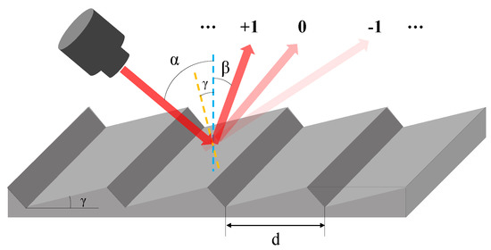 where m is the diffraction order. When the light is blazing at +1 diffraction order, a relationship between the incident, diffraction, and blaze angle γ can be extracted as Equation (2):