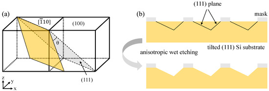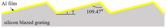 To fabricate the sawtooth grating groove, the tilted (111) silicon wafer was used as the substrate. Figure 5a illustrates the schematic diagram of titled silicon wafer cutting. It was cut by (111) silicon ingot, which rotated a certain angle θ from (111) crystal plane to (110) plane along [10] orientation. The cutting angle θ is equal to the designed blaze angle γ. According to the characteristics of anisotropic wet etching, the grating groove was formed by the intersection of slowly etched surface (111) faces, as shown in Figure 5b.