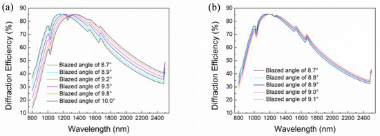 Diffraction efficiency of blazed gratings with blaze angle of (a) 8.7°, 8.9°, 9.2°, 9.5°, 9.8°, and 10.0°; (b) 8.7°, 8.8°, 8.9°, 9.0°, and 9.1°.