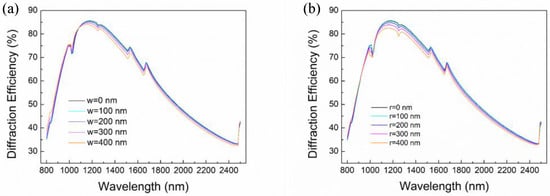 Diffraction efficiency with different (a) width of platforms; (b) radius of fillets.