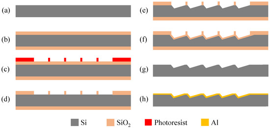 The fabrication flow of the blazed grating. (a) substrate preparation; (b) thermal oxidation of the substrate; (c) photoresist mask preparation; (d) SiO2 mask preparation; (e) anisotropic wet etching; (f) thermal oxidation of the grating; (g) SiO2 removing; (h) aluminum film deposition.