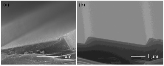 SiO2 mask was used as etching mask of gratings in the experiment. In order to reduce the influence of platform on the performance of gratings, the SiO2 mask should be minimized. RIE and BOE isotropic etching was used to fabricate SiO2 mask and reduce its width. Generally, it was difficult to accurately etch 300 nm-thick SiO2 layer and stop on the Si surface only using RIE technique. If the SiO2 layer was overetched, the underlying Si substrate would be also slightly etched, forming a large nub on the top of the grating groove after anisotropic wet etching process, as shown in Figure 7a. The nub was also shaped by (111) plane and hard to be eliminated, so the diffraction efficiency is reduced because of introducing stray light and narrowing the blazed facet. Whereas, long-time wet etching in BOE could damage and cause peeling of the photoresist. Therefore, after RIE etching of SiO2 for 250 nm, BOE was applied to etch the remaining SiO2, and the etching would spontaneously stop at the interface of SiO2 and Si. The grating groove fabricated in this way is shown in Figure 7b, and the nub is successfully avoided.
