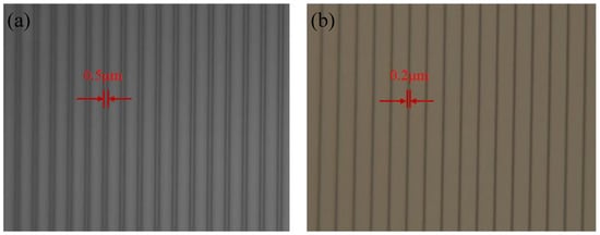Optimized parameters of RIE and BOE wet etching were investigated for good etching uniformity and small size etching mask. Sulfur hexafluoride (SF6) was used as the etchant gas, and oxygen (O2) was used as protection gas in the RIE process. A high SF6 flow and high etching power resulted in a high etching rate, which was set to be 30 sccm and 150 W respectively. As the O2 flow increased, anisotropy and uniformity of RIE etching were both improved. However, a small width of SiO2 stripes was needed in the experiment, which can be realized by isotropic lateral etching at low O2 flow. Moreover, high O2 flow would easily remove the photoresist, so O2 flow was set to be 5 sccm. After 180 s of etching by RIE, the thickness of the remaining SiO2 was 50nm, then it was overetched by BOE solution for 90 s. Images of photoresist stripes before etching process and SiO2 stripes after photoresist removing are shown in Figure 8. It could be seen that the width of the grating mask was narrowed from 500 nm to 200 nm.