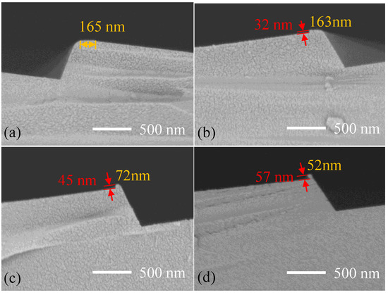 The gratings were prepared by anisotropic wet etching process. The exposed silicon was etched in the anisotropic etching solution at different rates according to the crystal direction. When the two (111) crystal planes intersected, the etching stopped, and the triangle blazed gratings were obtained. The blaze angle of the gratings was the tangent angle of tilted silicon wafer. For smooth grating surface, tetramethylammonium hydroxide (TMAH) solution with mass fraction of 25% was used in the experiment. The grating groove shapes at different etching time of 75 s, 3 min, 5 min, and 7 min were observed by scanning electron microscopy (SEM) after SiO2 mask removing, and the morphology of the platform on the top of the grating was analyzed. It was seen that a 165-nm-width platform was formed on the top of the grating due to the protection of a narrow SiO2 mask as the etching time was 75 s, as shown in Figure 9a. The rounded edge was caused by lateral corner cut corrosion. Then, a small nub emerges as the etching time increases, due to the over etching of the (111) planes and shaped by new (111) sidewalls. The height of the nub was 32 nm and the width was 163 nm after 3 min etching, as shown in Figure 9b. The nub became larger in depth and smaller in width with the increasing of etching time because of the constant etching of (111) planes, as shown in Figure 9c,d. When the etching time was 7 min, the width of the nub was 52 nm, and the height was 57 nm. However, the nub was difficult to eliminate further because the SiO2 stripes fell off as continuous etching. Moreover, the long-term wet etching led to an increase in surface roughness of the grating surface, which ultimately affected the diffraction efficiency. Hence, the suitable etching time was 75 s.