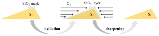 After anisotropic wet etching process, an oxidation sharpening process was subsequently employed to further decrease the platform without removing the SiO2 etching mask. Figure 10 schematically displays the oxidation sharpening process. The grating samples were thermally oxidated for hours at 1050 °C, oxidation rate at the top of the grating groove was much lower than that of the groove sides since the SiO2 mask was served as a barrier layer. As a result, the thermal oxide layers are mainly grown at the sides of the groove. Subsequently, the oxidation layer was etched in BOE solution until the Si surface was hydrophobic, and the grating groove was effectively sharpened.