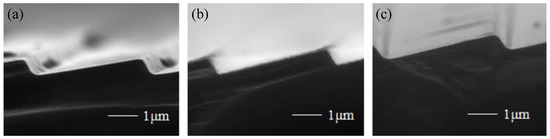 The grating groove depended on the oxidation time. The grating samples was oxidated at 1050 °C for 1 h, 2 h, and 4 h, respectively, and the SEM images of the gratings after the oxide layer removing are shown in Figure 11. It can be seen that the platforms decreased and finally converted to a fillet. The radius of the fillet first decreased and then increased as the oxidation time increased. There was a 150-nm-wide platform on the grating top when the oxidation time was 1 h. When the oxidation time increased to 2 h, the platform turned to a fillet, whose radius was 50 nm. However, continued oxidation for 4 h caused the fillet to become larger, and the radius was about 130 nm. Therefore, the optimized oxidation sharpening time was 2 h.