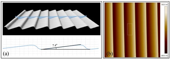 The grating profile measured by the optical profiler is shown in Figure 12a. The actual blaze angle was 7.4°, which had an offset of 1.4° to the designed value. This deviation mainly came from two sources. One was the cutting angle error of the tilted (111) substrate, another was the etching time difference between upper and lower surfaces. The atomic force microscopy (AFM) image of the blazed grating is also presented in Figure 12b. It could be seen that the measured root mean square (RMS) roughness of the grating surface with aluminum reflective coating was 0.477 nm, that proved the grating surface possessed great smoothness.