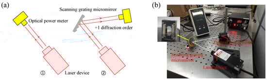 where Iλ,m is diffraction light power at diffraction order of m, and Iλ is the incident light power. Figure 14a schematically showed the measurement for absolute diffraction efficiency. The set up mainly consisted of a laser device, an optical power meter, and a scanning grating micromirror. First, the laser was normally incident into the optical power meter to directly detect the incident laser power Iλ. Then, the laser was incident into the center of the scanning grating micromirror with the incident angle of 14.1°, and the optical power meter was moved to detect the light power at +1 diffraction order Iλ+1. According to Equation (5), the absolute diffraction efficiency could be calculated. Figure 14b shows the photographic image of the measurement set up.