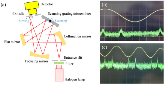 The diffracted wavelength range of the proposed scanning grating micromirror was tested with our previous NIR spectrometer setup [31]. As Figure 15a demonstrates, the light was emitted through a filter and an entrance slit. Then it was collimated by an off-axis parabolic mirror and reflected toward the scanning grating micromirror by using a flat mirror. The diffracted lights were reflected and focused on the detector’s plane through an exit slit. As the scanning grating micromirror tilted, the diffraction lights with varying wavelengths were scanned through the detector which gave the spectrum information for the incoming lights.