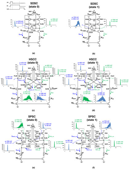 Figure 1e,f show the SPSC [10] at states 0 and 1, respectively. The SPSC uses a split path to employ the DRV technique and achieves PMOS degeneration to reduce the variation. Figure 2c shows that the SPSC successfully modifies Vref according to the MTJ state; the subsequent Vref0 and Vref1 values that confirm this are presented in Figure 1e,f. Furthermore, to overcome the process variation issue faced by the HSCC, the SPSC utilizes a split-path technique instead of current mirrors. Instead of employing current mirrors to transmit the NCD saturation current to the NOD as HSCC does, the SPSC uses the split path on the NCD source and applies the same gate-to-source voltage to both the NCD and NOD. As a result, even without a current mirror, the saturation currents of the NCD and NOD are equalized. The standard deviations of Vdata0,1 (Vref0,1) presented in Figure 1e,f is smaller than those of the HSCC because the number of current mirrors is reduced. Therefore, among the existing SCs, SPSC is superior in terms of the RAPYCELL. However, as shown in Figure 1e,f, the standard deviations of Vref0 and Vdata1 remain large (i.e., 106 mV and 101 mV). This is because the data current (Idata) is split in half by the split-path scheme (Idata = Idata_cm + Idata_sp), and the lowered current is sensitive to the increased process variations in deep submicron technology.