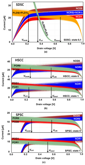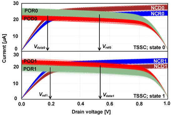 In SPSC, the lowered saturation current caused by the split path is vulnerable against process variations. The TSSC maintains the advantages of SPSC (i.e., the DRV technique, thereby increasing the sensing margin ΔV0,1) but overcomes the lowered saturation current problem. Figure 3a shows the schematic and timing diagram of the proposed TSSC. The key circuit design differences between the TSSC and SPSC are the inclusion of two transistors as switches (ST1 and ST2) and exclusion of NOD and NOR by implementing a timing-based split-path scheme. To reduce σΔV0,1 by enhancing the current for each path, the MOSFET operating times are controlled by the PRE signal. Figure 3b shows the TSSC operation in phase 1 (P1) at state 0. In P1, the PRE signal is high; thus, PD0, PD3, ST1, and ST2 are turned on at the beginning. The gate voltage of POR0 (POD0) starts to pre-charge as ST1 and ST2 are turned on. PLD0 and PLR0 reach saturation points after a sufficient pre-charge time if Idata0 and Iref0 are constant in P1, regardless of the process variations in PLD0 (PLR0). At the end of P1, the gate voltage of POR0 (POD0) is kept at the same value as Vdata0 (Vref0). However, POR0 and POD0 cannot operate because PD1 and PD2 are turned off, respectively. Figure 3c shows the TSSC operation in phase 2 (P2) at state 0. At the beginning of P2, the PRE signal is turned off. Thus, PD0, PD3, ST1, and ST2 are turned off, and PD1 and PD2 are turned on. When PLD0 and PLR0 are cut off from VDD, POR0 and POD0 can operate because the gate voltages of POR0 and POD0 are pre-charged to Vdata0 and Vref0, respectively, in P1. Thus, the saturation current of POR0 is transmitted from NCD0 as the SPSC. However, for TSSC, the saturation current of POR0 is approximately two times larger than that of the SPSC, regardless of process variation. This is because PLD0 is turned off in P2 and there is no current division. In addition, in the TSSC, without current division, the clamp NMOS number is less than that of the SPSC, which is achieved by shifting the split-path position to the drain of the clamp NMOS. Therefore, the TSSC implements the DRV technique with the minimization of σΔV0,1, which is confirmed by the TSSC voltage distribution diagram shown in Figure 3c,e. The process variation in the TSSC can be further decreased compared to the SPSC because in terms of iso-area, the size of MOSFETs in the TSSC can be increased as the number of clamp NMOS is reduced. Figure 3d,e show the TSSC operation at state 1 in P1 and P2, respectively. The TSSC operation at state 1 is nearly identical to that at state 0, with only a change in the MTJ state. Figure 4 shows the TSSC I-V curves, from which Vdata0,1 and Vref0,1 can be estimated. The crossing point in the I-V curves for NCD0 (NCD1) and POD0 (POD1) is the operating point for Vdata0 (Vdata1). Furthermore, the crossing point in the I-V curves of NCR0 (NCR1) and POR0 (POR1) is the operating point for Vref0 (Vref1). Vref is successfully modified according to the MTJ state, and operation current is nearly doubled compared to that of SPSC.