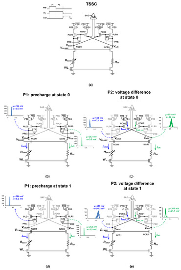 Figure 3. (a) Schematic and timing diagram of TSSC. Operations with TSSC voltage distributions in (b) phase 1 at state 0, (c) phase 2 at state 0, (d) phase 1 at state 1, and (e) phase 2 at state 1.