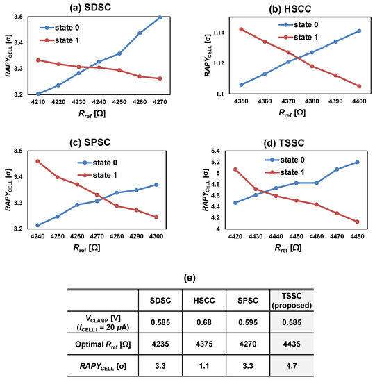 Figure 5. RAPYCELL0 and RAPYCELL1 of (a) SDSC; (b) HSCC; (c) SPSC; and (d) TSSC with respect to Rref. (e) Optimal Rref and RAPYCELL of SDSC, HSSC, SPSC, and TSSC.