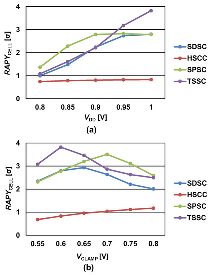 Figure 6. RAPYCELL of SDSC, HSCC, SPSC, and TSSC with respect to (a) VDD and (b) VCLAMP.
