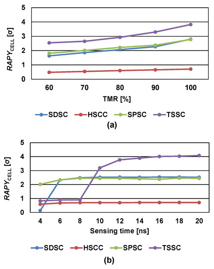 Figure 7. RAPYCELL of SDSC, HSCC, SPSC, and TSSC with respect to (a) TMR of MTJ and (b) sensing time.