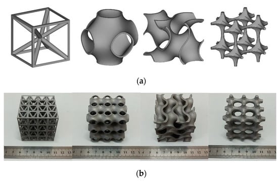The mathematical models and printed solid samples of four different structures are shown in Figure 2. All structures are constrained by the same relative density under the same cube size to ensure the rigor of the experiment. Detailed parameters of the structure studied in this paper are shown in Table 2.