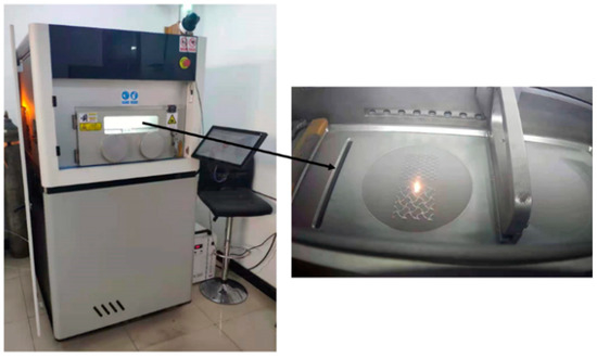 According to the characteristics of the four structures and the metal powder materials used (316L stainless steel), the SLM metal printer (ZRapid Tech SLM280) is equipped with a laser power of 500 W, and a continuous IPG mirror fiber laser is selected to print parts in a nitrogen-filled printing chamber to reduce oxidation. SLM processing parameters are shown in Table 3, and the SLM printer and printing process are shown in Figure 3. The metal powder used in this study is spherical 316L stainless steel powder with an average particle size of 15–53 μm and a loose density of 3.9 g/cm3.