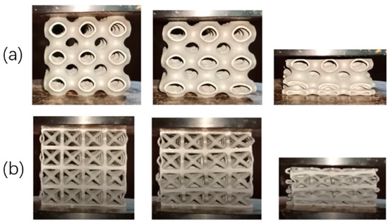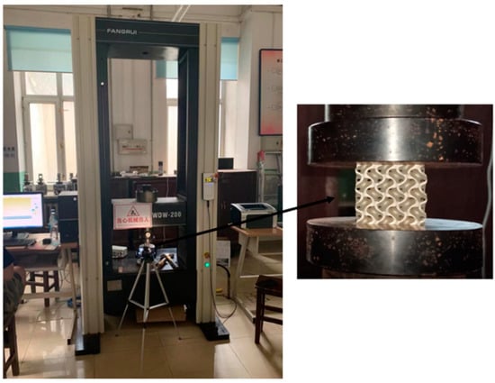 The compression test was carried out on an INSTRON 3328 universal mechanical testing machine, and the loading direction was the same as the printing direction of the parts [39]. The universal mechanical testing machine and test process are shown in Figure 4. The compression deformation rate is 9 × 10−3 mm/s. Linear variable differential transformer (LVDT) was used to collect deformation data, and the collapse of each specimen was recorded by video at a 50 Hz frame rate.