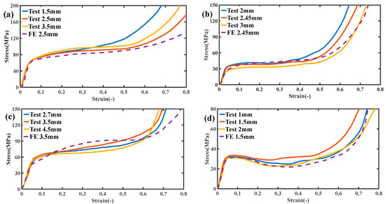 Experimental and numerical simulation of stress–strain curves for (a) Gyroid surface, (b) Bcc lattice structure, (c) Primitive surface, (d) truss lattice structure.