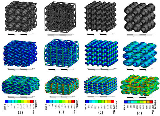 (a) Gyroid surface, (b) Bcc lattice structure, (c) Primitive surface, (d) truss lattice structure, meshing and stress cloud of finite element analysis under given strain.