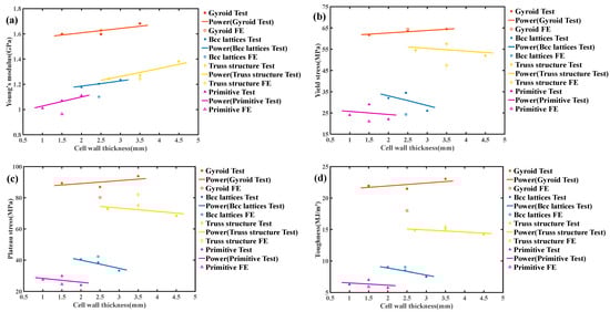The mechanical properties of all test blocks were extracted from stress–strain data in numerical simulation and compression experiments. Here, the mechanical properties of each test block were judged mainly based on Young’s modulus, yield stress, plateau stress, and toughness. The Young’s modulus is calculated according to the slope of the curve at the linear elastic stage, the yield stress is calculated according to the obvious inflection point when the curve enters the yield stage, the plateau stress is calculated according to the average stress within the range of 0.2–0.3 strain, and the toughness is the area under the stress–strain curve within the range of the 0–0.25 strain. Figure 8 shows the elastic modulus, yield stress, platform stress, and toughness of the four structures as a function of unit thickness. Since the relative density of this experiment is fixed, we do not make any processing of the data, and directly compare the four mechanical properties.
