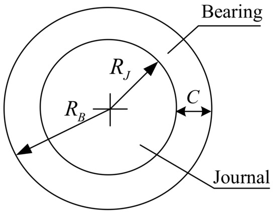 Figure 1 depicts a revolute joint with clearance. The radius of bearing and journal in the revolute clearance joint are and , respectively. The difference between their radii is defined as the radial clearance. Thus, the radial clearance is expressed as Equation (1):
