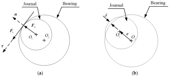 Usually, there are contact-impact characteristics in a real joint with clearance in mechanisms, which includes normal contact force and tangential friction force, shown in Figure 2. When the journal and bearing are in contact, a contact force is applied perpendicular to the plane of contact. The contact forces between the two elements of clearance joints can be described as normal contact force, , and tangential contact force, . Therefore, the constraints of clearance joint are modeled as contact force constraints, which is in line with the real joint. The contact deformation caused by contact and impact between bearing and journal can be represented as Equation (2):
